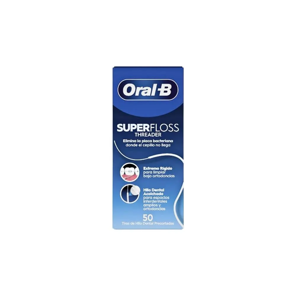 Oral-B SuperFloss 50 m, diseñado para limpiar eficazmente alrededor de aparatos ortodónticos, puentes, coronas y espacios amplios entre dientes